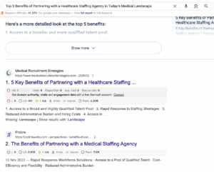 In this example, creating a blog is necessary to pass equity and increase the findability of the ranking “healthcare staffing” for Cucumber Recruitment.