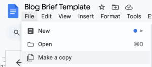 The first thing you’ll want to do, depending on your task, is go into the Google Drive and select the task-specific template. This only applies if your task has a template within the drive, such as when completing a blog brief.