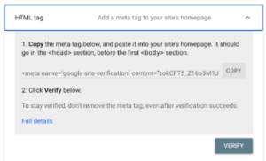 Choose the HTML tag verification method and copy the meta tag Google gives you.